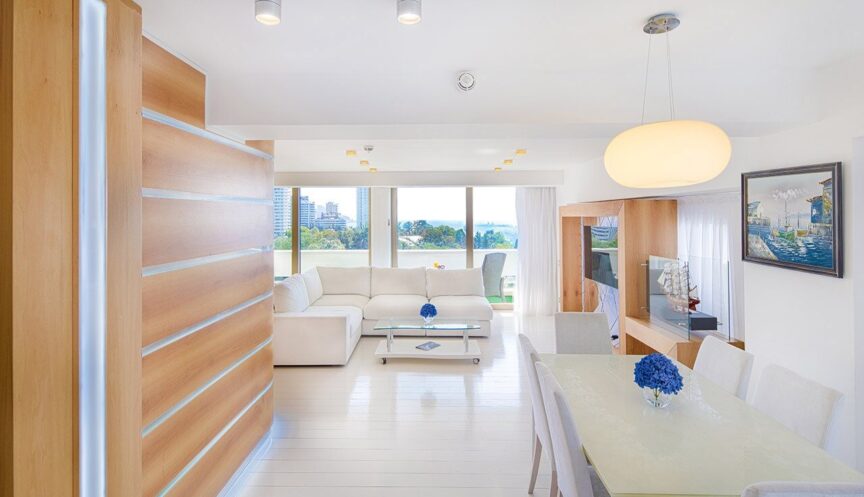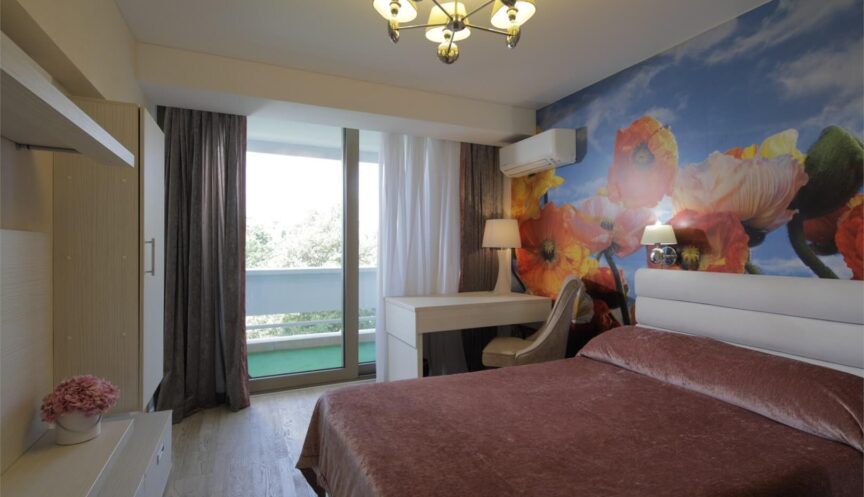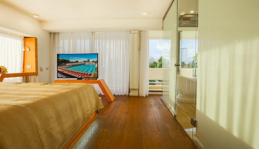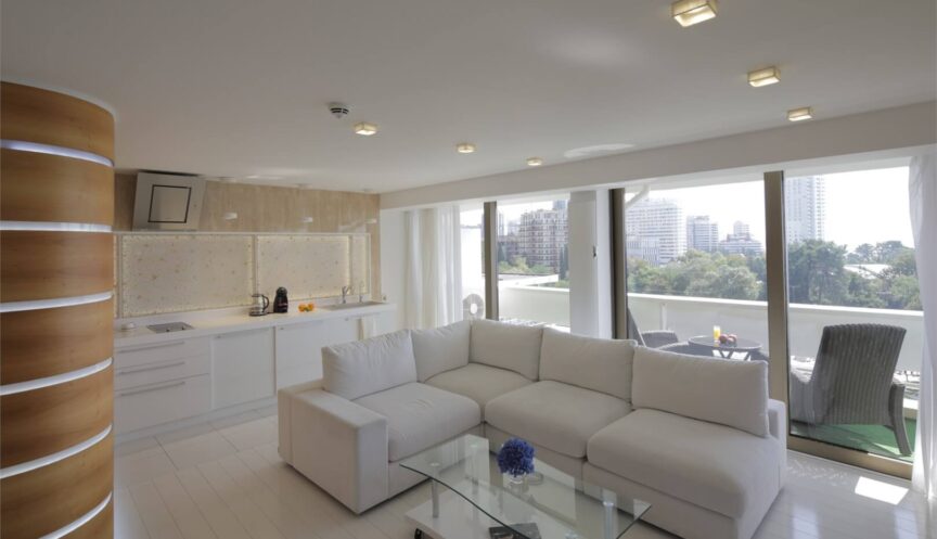 В номере есть три комнаты. Это апартаменты площадью 130 квадратных метров. В номере предусмотрено четыре основных места для проживания и два дополнительных — для размещения на диване.