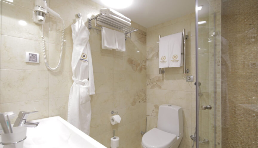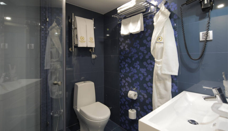 Санузел оборудован ванной, предоставляются тапочки, туалетные принадлежности, фен и халат.