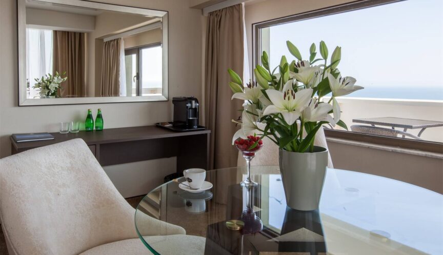 Двухкомнатный люкс площадью 54,7 кв. м предлагает великолепный вид на море. В номере есть дополнительное место — диван. В вашем распоряжении будет двуспальная кровать, мебель для удобства (диван, кресла, стол со стульями, вешалка, шкафы и прикроватные тумбочки), а также все необходимые удобства для комфортного проживания.