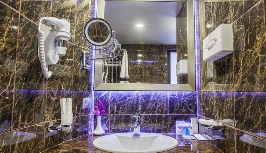 Номер оснащён кондиционером, мини-холодильником, набором посуды, сейфом, ЖК-телевизором и телефоном. В санузле вас ждёт джакузи, тапочки, туалетные принадлежности, фен и халат.