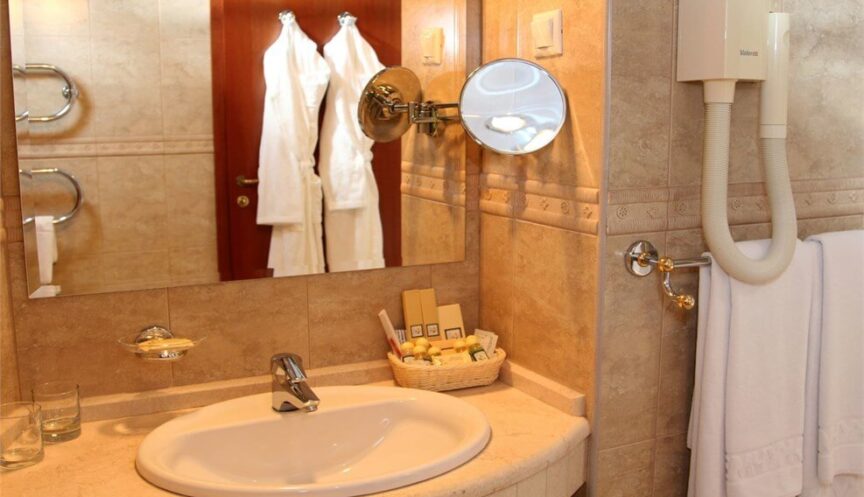 В номере есть всё необходимое для комфортного проживания: вешалка, диван, зеркало, двуспальная кровать с прикроватными тумбочками, стол, стулья и шкаф. Также установлены кондиционер, мини-холодильник, набор посуды, сейф и ЖК-телевизор с телефоном.