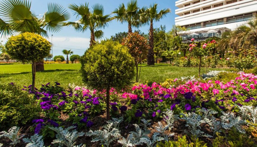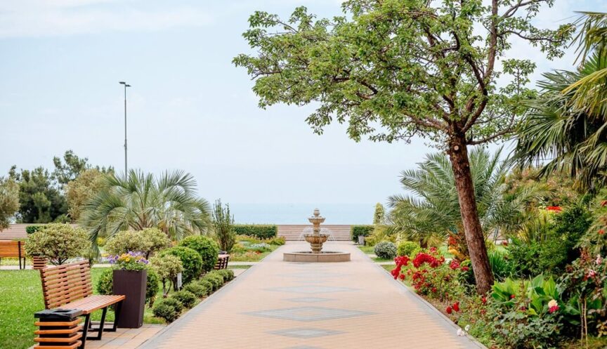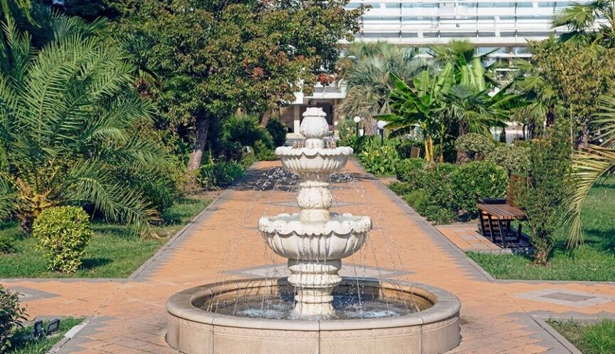 Вся территория отеля представляет собой живописную парковую зону с субтропической растительностью и захватывающими видами на морскую даль. В парке, изобилующем вечнозелеными растениями, фруктовыми деревьями и цветочными клумбами, расположены удобные пешеходные аллеи со скамейками. Рядом с фонтаном и итальянскими пальмами можно увидеть забавные топиарные фигуры. Дизайн ландшафтного озеленения, декоративные газоны и изысканные малые архитектурные формы гармонично сочетаются с природным окружением, создавая уникальную атмосферу для прогулок и отдыха на свежем воздухе.